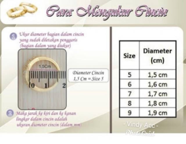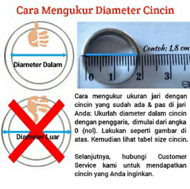 Cara mengukur diameter cincin. Pada panduan pengukuran jari dari ORORI Anda dapat menemukan berbagai contoh diameter cincin beserta ukurannya. Lalu ukur panjang kertas yang ditandai tersebut dengan penggaris dalam. Semua cincin emas atau silver tulen pasti akan mengunakan size asia.