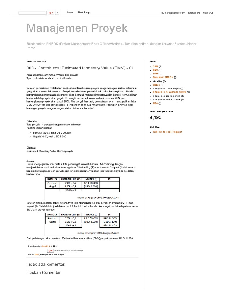 001 contoh soal earned value management evm 01 area pengetahuan. Contoh soal emv. EMV alternatif-i payoff kondisi 1 x probabilitas kondisi 1 payoff kondisi 2 x probabilitas kondisi 2.